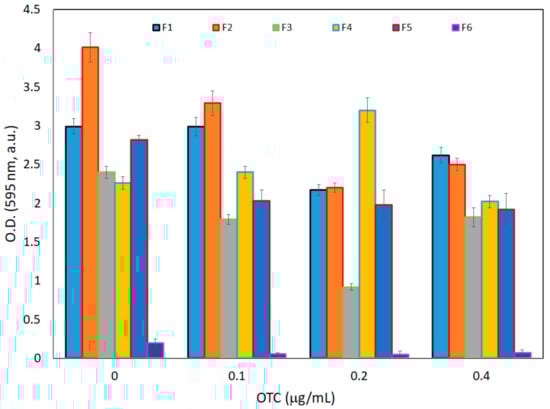 For P. aeruginosa (Table 3), the highest microbial mass retention capacity is observed for F5 and F6 biofilters, in the absence of OTC. Starting with 0.2 µg/mL OTC, a sharp decrease in the amount of biofilm formed is observed. A similar behavior was observed for the C. violaceum strain, with the most considerable amount of biofilm retained on the F1, F5, and F6 biofilters. These results show the complexity of the phenomena involved in the formation of the biofilm and the importance of the nature of the interactions between the biofilm and the solid support.