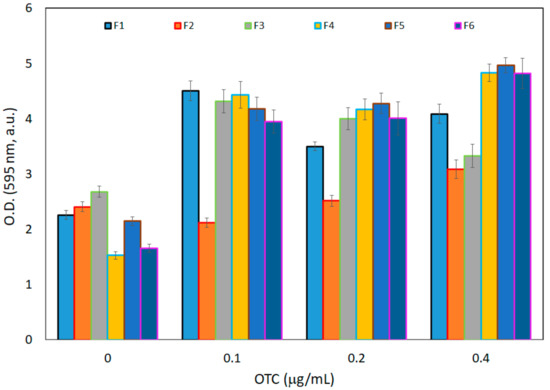 The results are similar to those obtained in experiments based on the gravimetric determination of the amount of biofilm formed. Thus, for P. aeruginosa, a slight decrease of the optical density values is observed (Figure 8) by adding antibiotics at low concentrations (0.1–0.2 µg/mL), followed by an increase in OD at higher OTC concentrations. This increase could also be attributed to the bacterial species’ exposure to the antibiotic in the environment and the antimicrobial effect of OTC being more pronounced at lower concentrations [20,22].