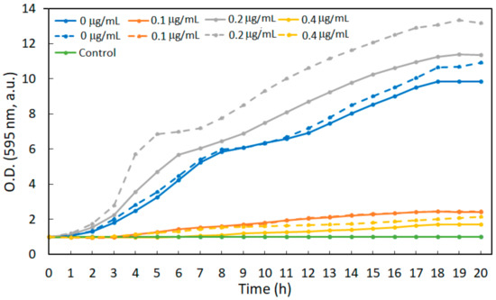 To study how the identified bacterial strains react to a specific culture medium, P. aeruginosa and C. violaceum were cultured in a synthetic medium. For this, a growth curve for these bacteria was generated, resulting from the variation in the optical density (OD) of the synthetic medium, both in the absence and in the presence of OTC, at different concentrations (Figure 10). For comparison, a control solution represented by the synthetic medium without inoculum or OTC was used.
