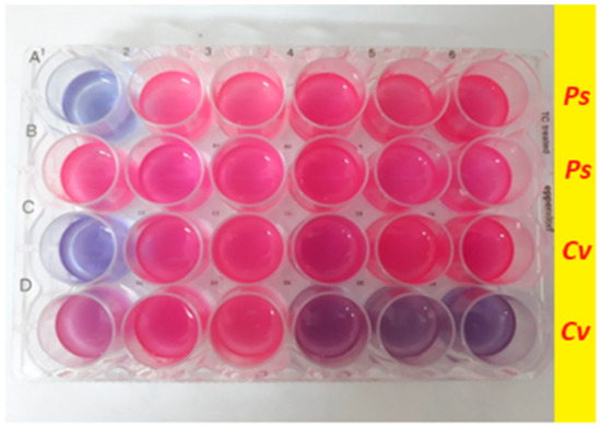 Resazurin test—biofilm of P. aeruginosa and C. violaceum: synthetic medium (A1/C1); without OTC (A2, A3/C2, C3); 0.1 µg/mL OTC (A4, A5, A6/C4, C5, C6); 0.2 µg/mL OTC (B1, B2, B3/D1, D2, D3); 0.4 µg/mL OTC (B4, B5, B6/D4, D5, D6).