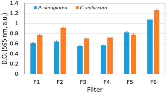 The experimental results (Table 4) show that the F1, F2, F3, F5, and F6 biofilters retained a higher amount of bacterial mass of C. violaceum, except for the F5 biofilter, which was more efficient for the P. aeruginosa strain. Both bacterial species developed better in the synthetic medium. Although the cell density is lower in the synthetic medium solution than in the LB medium, the biofilm amount deposited on the biofilters is significantly higher. This effect can be attributed to the nutrients present in the synthetic environment, especially nitrogen compounds (they are denitrifying bacteria [51]), which seem to strengthen these strains, conducing to a better adhesion to the surface of biofilters. Consequently, this may lead to an increase in the bioremediation potential of these biofilm/biofilter systems in the purification of aquaculture waters, even in conditions of antibiotic-contaminated waters.