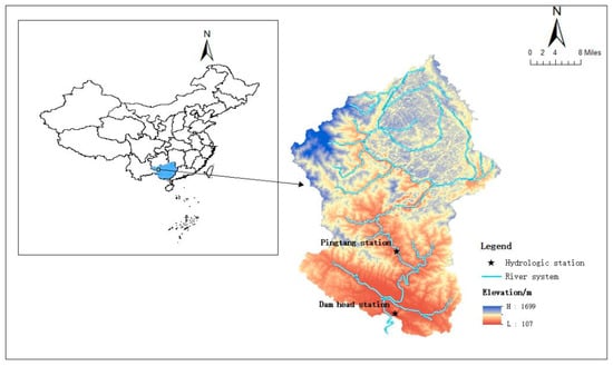 Chengbi River originates from Taiyi Village, Yuhong Yao Township, at the north foot of Qinglong Mountain, Lingyun County, Guangxi. It is a first-class tributary of Youjiang River in the upper reaches of Yujiang River of Xijiang River system in the Pearl River Basin (Figure 1). The total area of the basin is 2087 km2, of which the length of the main stream of the basin is 151 km, with an average drop of 3.87‰, an average elevation of 650 m and a total drop of 491 m.