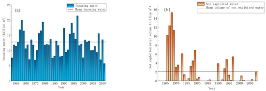 (a) Incoming water situation of Chengbi River Reservoir from 1963 to 2011 and (b) Not-exploited water of Chengbi River Reservoir from 1963 to 2011.