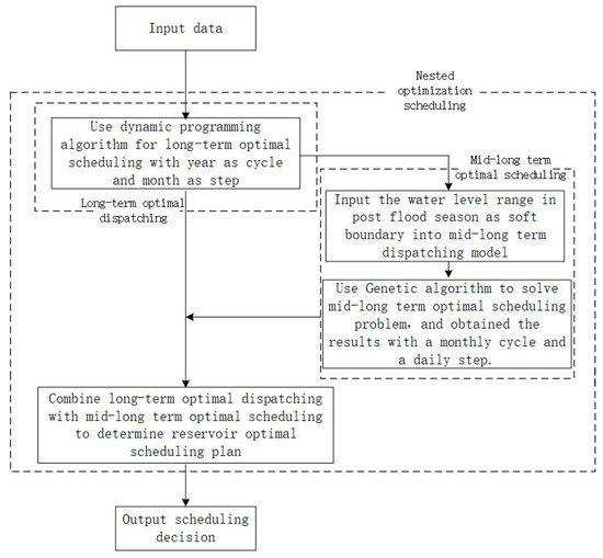 Due to the different characteristics and adaptive models of the solution methods of the decision scheme, different algorithms are used to solve the long-term optimal scheduling and mid-long-term optimal scheduling in the nested optimization scheduling model. Dynamic programming algorithm belongs to deterministic optimization algorithm and is suitable for solving long-term optimal scheduling decision. It is advisable to adopt intelligent optimization algorithm to solve medium and long-term optimal scheduling decision scheme, while genetic algorithm belongs to intelligent optimization algorithm and is a global optimization method based on simulated biological evolution and natural selection mechanisms. Due to its advantages of simple operation and strong robustness, it is widely used in water resource optimization problems [51]. Therefore, this paper takes the dynamic programming method as the solution method of long-term optimal scheduling decision, and genetic algorithm as the solution method of mid-long-term optimal scheduling decision. The flow chart of optimization scheduling nested model (Figure 3).
