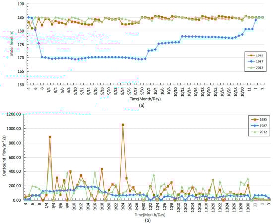 In this paper, hydrologic frequency analysis method [53] was used to determine the typical years. The P-III fitting line [54,55] was used for the average daily flow data from 1963 to 2014 at Dam head station of Chengbi River, and the hydrological years with guarantee rates of 25% (1985), 50% (1987) and 75% (2012) were selected as the typical years with abundant, flat and dry conditions. After determining the typical year, the actual inflow flow in the typical year was input into the model for calculation, and the calculation results of water level control and flow control in 1985, 1987 and 2012 were obtained (Figure 4).