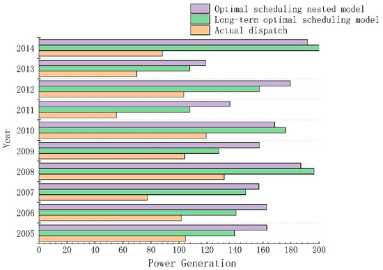 In order to fully verify the effect of optimal dispatching nested model on power generation, the incoming flow of nearly ten years (2005–2014) was input into nested model and long-term optimal dispatching model, and the annual power generation of different dispatching models was counted (Figure 6). It can be seen that in the decade from 2005 to 2014, the power generation generated by optimal dispatching nested model was the highest except in 2008 and 2014. Compared with the long-term optimal operation model, it is reduced by 9.83 GW·h and 10.02 GW·h, respectively, which shows that the nested model of optimal operation has a certain universality for the improvement of reservoir power generation.