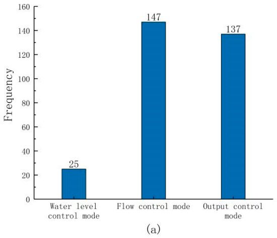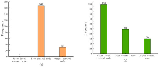 Count the times that 300 groups of predicted runoff power generation benefits and not-exploited water volume reach the maximum value and the times that water level exceeds the limit under three different control modes (Figure 7). It can be seen from (Figure 7a) that the power generation benefits of the three control modes are as follows: the water level control mode achieves the maximum power generation benefits for the least times, only 25 times, the flow control mode 147 times, and the output control mode 137 times. It can be seen from (Figure 7b) that the water level exceeding limits of the three control modes are as follows: water level exceeding limits does not occur in the water level control mode during the observation period, water level exceeding limits occasionally occurs in the output control mode, and water level exceeding limits occurs 167 times in the flow control mode. Further analysis of the performance of abandoned water in the three control modes shows that, as shown in figure (Figure 7c), the not-exploited water volume in the water level control mode is higher than that in the other two control modes, with a total of 198 times reaching the maximum value, followed by the flow control mode and the output control mode, which are 98 times and 60 times, respectively.