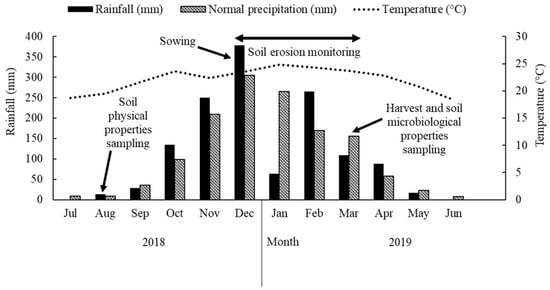 Daily average temperature and monthly precipitation data during the monitoring period (August 2018 to July 2019). The normal precipitation corresponds to the period from 1927 to 2013. Adapted from Silva et al. [16].