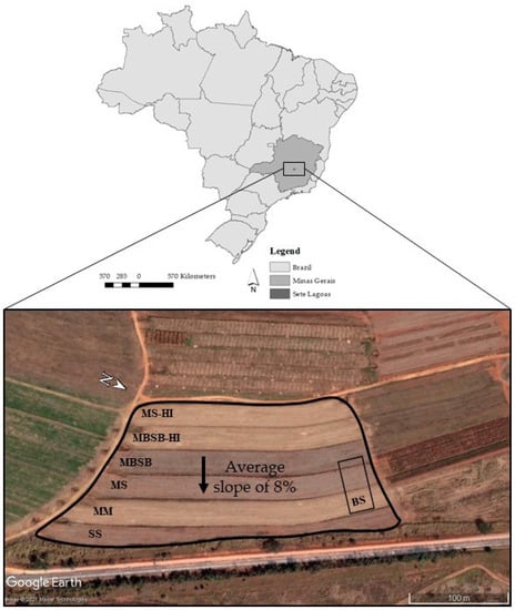 - Santos, H.G.; Jacomine, P.K.T.; Anjos, L.H.C.; Oliveira, V.Á.; Lumbreras, J.F.; Coelho, M.R.; Almeida, J.A.; Araújo Filho, J.C.; Oliveira, J.B.; Cunha, T.J.F. Sistema Brasileiro de Classificação de Solos, 5th ed.; Embrapa Solos: Brasília, Brazil, 2018; ISBN 978-85-7035-800-4. [Google Scholar]