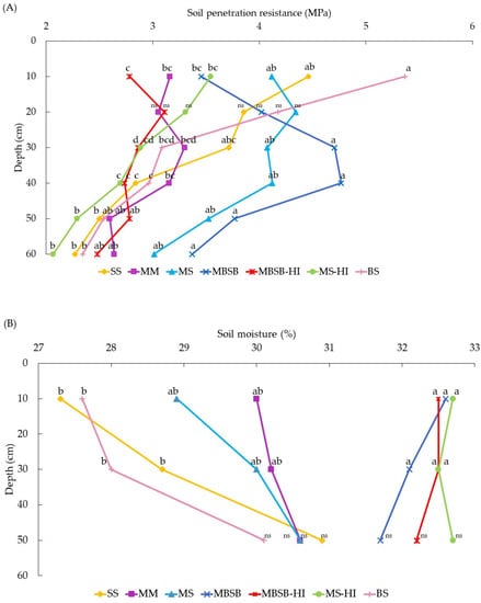 Soil penetration resistance (PR) for each treatment assessing 0–60 cm (A) and soil moisture (B) for three different depths (0–20 cm, 20–40 cm, and 40–60 cm) at the time of evaluation of soil penetration resistance. Means followed by different letters among treatments differ by Tukey’s test (p < 0.05). SS = soybean monoculture, MM = maize monoculture, MS = maize/soybean annual rotation, MBSB = maize/brachiaria/soybean/brachiaria rotation, BS = bare soil, HI = high input of fertilizers, and ns = not significant.