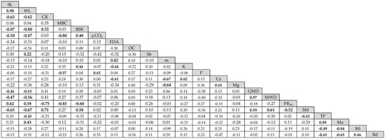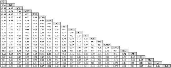 Both SL and WL showed a strong inverse correlation with BSR (Figure 6), stronger than that observed for these indicators for the crop row data (Figure 4). Furthermore, SL and WL were significantly inversely correlated with CR, qCO2, GMD, MWD, and SM. CR was not correlated with MBC, but had a strong positive correlation with BSR. BSR was moderately correlated with PR10, and SM; and FDA was inversely correlated with K and Ca.
