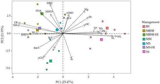 Principal component analysis for variables sampled in the crop rows. SL = soil losses, WL = water losses, CR = cover rate, MBC = microbial biomass carbon, BSR = basal soil respiration, qCO2 = metabolic quotient, FDA = fluorescein diacetate hydrolysis, OC = soil organic carbon, Sb = sum of bases, m = aluminum saturation of soil, K = potassium, P = phosphorus, Ca = calcium, Mg = magnesium, MWD = mean weight diameter, GMD = geometric mean diameter, PR10 = soil resistance to root penetration at 10 cm depth, SM = soil moisture in situ, TP = total porosity, Ma = macroporosity, Mi = microporosity, Bd = bulk density, SS = soybean monoculture, MM = maize monoculture, MS = maize/soybean annual rotation, MBSB = maize/brachiaria/soybean/brachiaria rotation, BS = bare soil, and HI = high input of fertilizers.