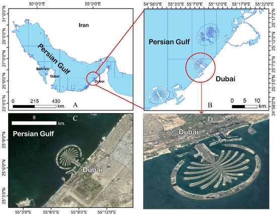 The Study area is the PJI located on the Persian Gulf islands around Dubai and its surrounding waters. PJI is located on 25°07′09.2′′ N 55°07′49.3′′ E of geographic longitude and latitude coordinates (Figure 1). It has an area of 7.6 km2 [45] and homes a population of 78,000 [46]. The Palm Jumeirah is the first of a series of man-made islands off Dubai’s shore; the project began in 2001 [47] and was completed in 2008, adding 56 km to the coastline [48]. The project involved adding 120 million cubic meters of sand and 7 million tons of rock to the sea [46]. An offshore crescent barrier enclosing the island, with a total length of 11 km, was built at the same time to defend the island from wave attacks [49].
