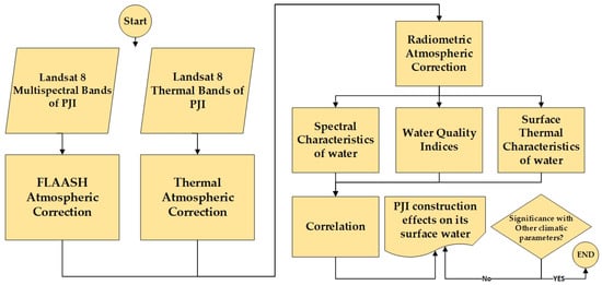 After collecting the images, they were corrected radiometrically and atmospherically through ENVI software and the Fast Line-of-sight Atmospheric Analysis of Spectral Hypercubes (FLAASH) algorithm, which is recommended for atmospheric correction over ocean or water body images. Then each image’s spectral reflectance was analyzed through the transition of years from 2001 to 2014, 2016, 2019, and 2020. Then water indices were calculated to show and compare the changes in water content through changes in the indices values. Finally, the Sea Surface Temperature (SST) was calculated for the study period, to monitor changes in water temperature.