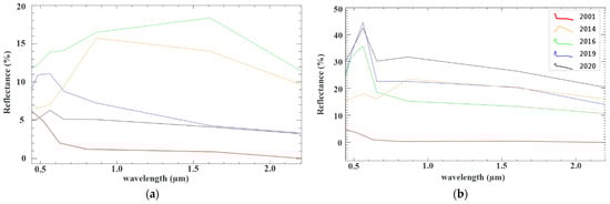 Figure 4a clearly illustrates that the maximum reflectance has shifted to shorter wavelengths during the time period under review. The maximum water reflectance was 0.8~0.9 µm in 2014, and it had shifted to 0.5~0.6 µm in 2019 and 2020. Although the maximum reflectance of surrounding water was 1.6~1.7 µm in 2016, two peaks in 0.8~0.9 µm (near to 2014) and a high value of reflectance in 0.5~0.6 µm (near 2019 and 2020) are observed. It is while the reflectance was at 0.483 µm in 2001 that it shows an observable shift of the maximum reflectance to shorter wavelengths. Figure 4b also shows an almost regular trend with a regular increase of mean of water reflectance in 0.5~0.6 µm and 0.6~0.7 µm of wavelength from 2001 to 2016.