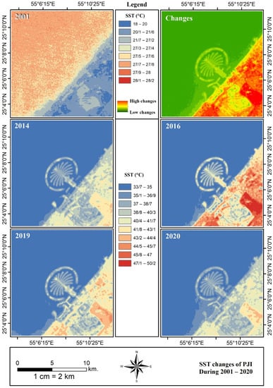 The calculated SST maps for 2001, 2014, 2016, 2019, and 2020 of PJI together with the overall map changes during this period.