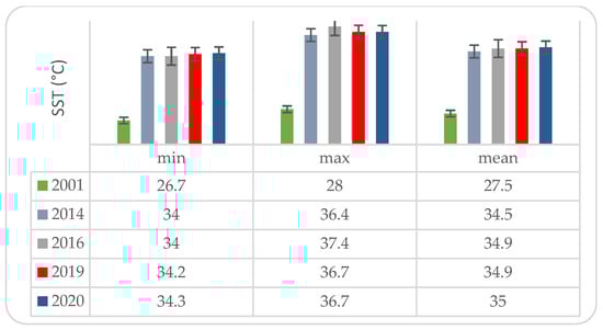 As shown in Figure 6, the island’s surrounding water surface temperature has gradually warmed since the island was built in 2001. The change map shows this change visually (Figure 6). The statistics of the SST maps indicate that the mean of the SST around the island has continuously increased from 27.5 °C in 2001 to 34.5 °C in 2014, 34.9 °C in 2016 and 2019, and finally, 35 °C in 2020. The maximum and minimum SST also increased constantly from 28 and 26.7 °C, respectively, in 2001 to 36.7 and 34.3 °C, respectively, in 2020 (Figure 7).