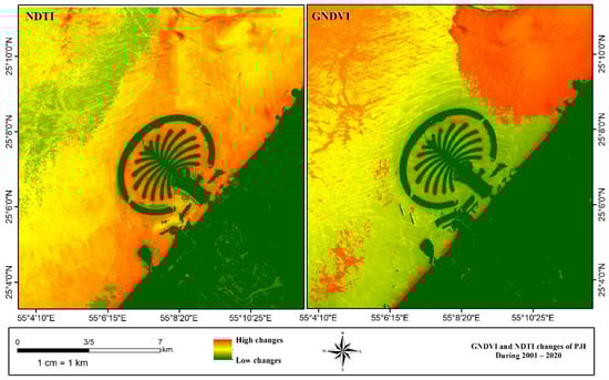 The GNDVI and NDTI change maps for PJI’s surrounding water from 2001 to 2020.