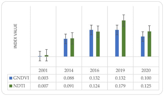 Based on the indices results (Figure 9), GNDVI permanently increased from 0.003 in 2001 to 0.132 in 2019 in the water surrounding PJI. The NDTI results also confirm a similar trend around the island, it has had increased from 0.007 in 2001 to 0.179 in 2019. In 2020, a small decrease was observed in the GNDVI and NDTI results from 2019 (by 0.032 and 0.054, respectively) to 0.1 and 0.125, respectively.