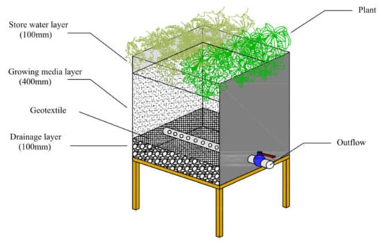 Experimental devices made of PVC material were set up in the Stormwater Laboratory of Beijing University of Architecture (N 39045′1.47″, E 116016′56.85″), with height, length, and width of 0.6, 0.8, and 0.8 m, respectively (Figure 1). The depth of the water storage layer of the device was 10 cm; vegetation layer was a mixture of plants; thickness of the media layer was 40 cm; the filter layer of the device was composed of geotextile with a density of 250 g/m2; and the bottom of the device comprised a drainage layer composed of gravel with a thickness of 10 cm and diameter of about 1 cm and a drainage pipe made up of a 5-cm-diameter through-hole blind pipe.