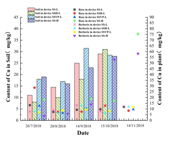 It has been reported that heavy metals in soil mainly exist in four forms: dissolved, exchangeable organic and inorganic forms, minerals, and precipitates formed with other soil components [,]. However, plants can only absorb dissolved heavy metals and exchangeable heavy metals in organic and inorganic forms from the soil. Most of the heavy metals in the soil are combined with mineral and organic matter, which cannot be utilized by plants. Therefore, organic matter plays an important role in determining the availability and mobility of heavy metals in soil []. Organic matter can participate in the supply of organic chemicals to the soil solution, which may act as chelates to increase the supply of heavy metals to plants []. In addition, when compared with passive absorption of Cu by plant roots, Zn can be actively absorbed by plant roots in the form of ions and, to a certain extent, in the form of organic chelate []. This can also explain the reason for decrease in the Zn content in the soil of the devices examined in the present study, with decrease in Zn content decline in SSH-L with higher organic matter content being greater than that of SS-L. Comparison of the Zn enrichment ability of soil in the three devices with different media layers revealed the following trend: SSVP-L > SS-L > SSH-L. The final Zn content in R. xanthina in SS-L, SSH-L, SSVP-L, and SS-H was 105.3%, 103.3%, 91.4%, and 372.3% higher than the corresponding background Zn content determined in R. xanthina before the start of the experiment, respectively. The final increase in the Zn content in B. thunbergii in SS-L, SSH-L, SSVP-L, and SS-H was 181.5%, 244.9%, 184.2%, and 544.4%, respectively. Under the condition of high concentration of influent, the final increase in the Zn content in R. xanthina and B. thunbergii was four- and three-fold higher than that noted under low influent concentration, respectively.