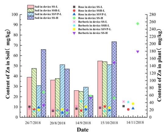 As shown in Figure 3, a certain difference was noted in the Zn content in the soil of the four devices before the start of the experiment. During the study period, SS-L and SSH-L presented a relatively similar change in the soil Zn content, when compared with the background Zn value, and both the devices exhibited a gradual decline in the soil Zn content from 26 July 2018 to 14 September 2018, and a subsequent increase from 14 September 2018 to 18 October 2018, exceeding their respective background Zn values, with final Zn content in the soil of SS-L and SSH-L being 140.5% and 113.7% higher than the background values, respectively. Before the start of the experiment, the background Zn content in the soil of SSVP-L was lower than that in the soils of SS-L and SSH-L, and presented a different variation trend. The Zn content in the SSVP-L soil increased from 26 July 2018 to 20 August 2018, decreased from 20 August 2018 to 14 September 2018, and increased again from 14 September 2018 to 18 October 2018, finally becoming 165.7% higher than the background value.