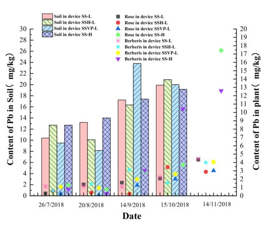 The Pb content in the soil of the four devices (Figure 4) examined showed an overall upward trend. In particular, a significant positive correlation was observed between the Pb content and Cu content in the soil of SS-L and SSVP-L (p < 0.05); however, after the increase in the Pb content to a certain extent in the SSVP-L, a downward trend was observed, which may be owing to self-purification promoted by microorganisms and various acids in the soil, as well as soil Pb absorption by plants.