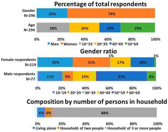 Because the gender, age, and number of household members of the respondents were similar in the first and second surveys, the two surveys were compiled and analyzed together. Respondents’ attributes are shown in Figure 1. In the survey design, the target respondents were women’s university students and their families, which resulted in a small number of respondents in their 30s. However, we were able to obtain 296 valid responses, with a male: female ratio of 26:74, with both men and women ranging in age from their teens to their 60s. As mentioned earlier, this survey has a large number of female subjects, and the following analysis was conducted by defining 10s and 20s as the young female population, and 40s and 50s as the middle-class female population. The ratio of the young generation to Japan’s female population is about 18%, and the ratio of the middle-class generation is about 27% []. Together, the respondents to this survey represent 45% of the entire generation of Japanese women.