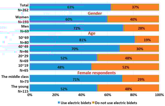 Respondents who had electric bidets installed in their homes were asked whether they used them. The results are shown in Figure 2. Overall, 72% of men and 60% of women answered that they used an electric bidet at home. Men tended to be more likely to use an electric bidet at home. With regard to age, 48% of the respondents in their teens, 52% of those in their 20s, 70% of those in their 40s, and about 81% of those in their 50s and 60s answered that they used an electric bidet. The older the respondent, the higher the likelihood that they would use an electric bidet; a chi-square significance test showed a significant difference by age (p < 0.001). The intergenerational comparison of women was more pronounced, with 72% of the female respondents in their 40s and 50s using electric bidets, compared with 52% of those in their teens and 20s. This difference was also significant (p = 0.009). These trends are in good agreement with the survey information disclosed on the web [,], and were judged to be valid survey results.