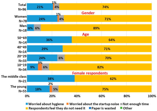 Next, the 98 respondents who answered that they do not use electric bidets were asked why not. Figure 3 shows the results. Of these respondents, 70% did not feel the need to use an electric bidet and 20% were concerned about hygiene. The tendency of not feeling the need was seen more in respondents in their teens and 20s. These trends are also in good agreement with the results of the questionnaire survey disclosed on the web [,].