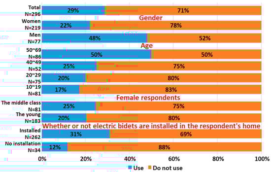 In this survey, 89% of homes had electric bidets installed, which is close to the 80.4% (as of 2019) stated in the Cabinet Office’s consumption trend survey []. Therefore, the results of this survey provide an accurate insight into the average usage of electric bidets in homes.
