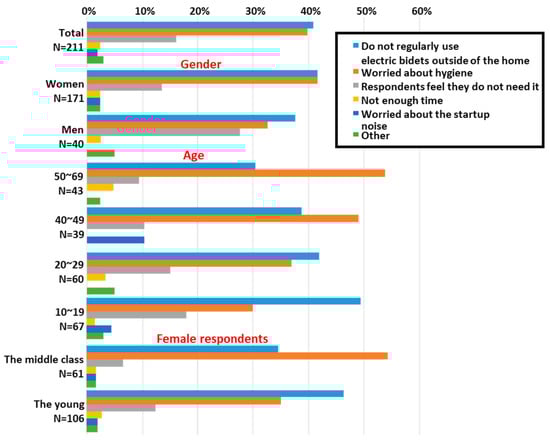 The use of an electric bidet outside the home was also investigated in the same way. Figure 4 shows whether respondents use electric bidets and Figure 5 shows their reasons for not doing so. The non-use rate increased from 37% at home to 71% outside, and 69% of respondents who used it at home did not do so when they were outside. This tendency was more pronounced among women and younger respondents. The number of respondents who cited “hygiene concerns” as a reason for not using bidets jumped from 20 out of 96 when using them at home to 84 out of 210 when using them outside the home. Toilets in places outside the home are used by an unspecified number of people. Therefore, it was inferred that respondents were hesitant to use electric bidets because of growing concerns about hygiene.