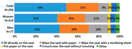 The tendency to be hesitant to use electric bidets because of hygiene concerns was also reflected in the survey results on how respondents sit on toilet seats outside the home. In toilets at home, 80%–90% of both men and women sat directly on the toilet seat. However, in toilets outside the home, as shown in Figure 6, direct seating was less common and people took hygiene measures such as placing toilet paper on the toilet seat or wiping the seat with a sanitizing sheet.