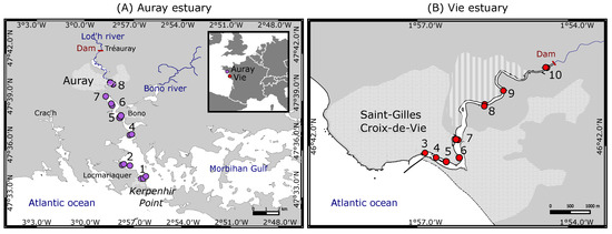 Location of sampling sites along the Auray (A) and Vie (B) estuaries. Sites Vie 1, Vie 2 and Auray 3 are not considered for this study. Hatched zones represent urbanised areas and stripes represent salt marshes.