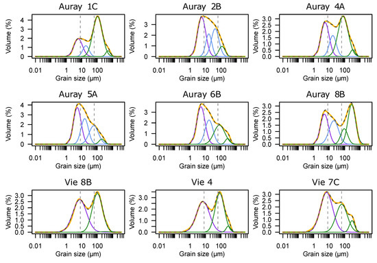Sediment grain size distribution (yellow dashes curves), and grain size populations reconstructed with Peakfit® software version 4.12 (solid-coloured curves) for 10 typical stations of Auray and Vie estuaries (location on Figure S1). A, B, C: from high to low mudflat. See Supplementary Table S3 for numerical data and Supplementary Figure S1 for other stations.