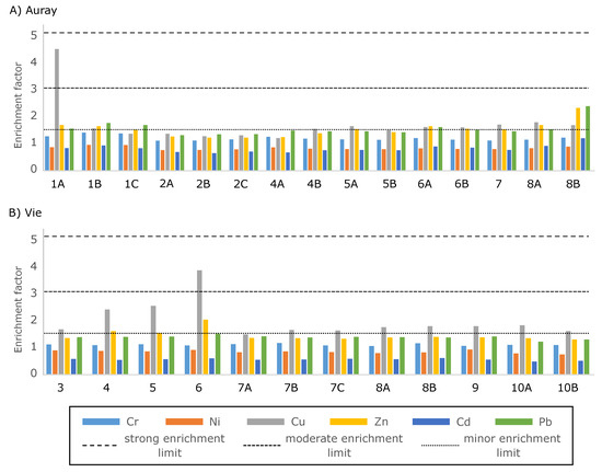 Enrichment factors calculated for Cr, Ni, Cu, Zn, Cd and Pb in stations of the Auray (A) and Vie (B) estuaries. Limits of strong, moderate and minor enrichment are according to Larrose et al., 2010. See Supplementary Table S4 for detailed data.