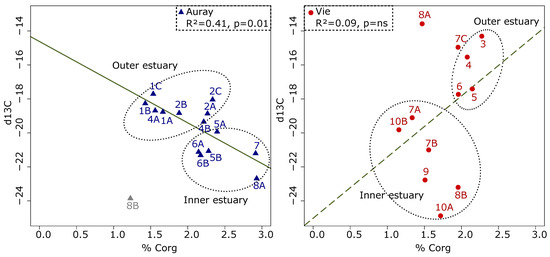 Relationship between the organic carbon content and δ13C in the Auray (left) and Vie estuaries (right). In the Auray estuary, station 8B has not been taken into account.