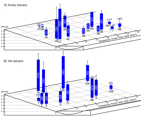 Total foraminiferal density in the Auray (A) and Vie (B) estuaries. The stations are ordered from the outer (left) to the inner estuary (right). The numbers correspond to the mean density of the three replicates and are expressed in individuals/50 cm3.