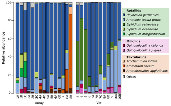 - Debenay, J.-P.; Bicchi, E.; Goubert, E.; Armynot du Châtelet, E. Spatio-Temporal Distribution of Benthic Foraminifera in Relation to Estuarine Dynamics (Vie Estuary, Vendée, W France). Estuar. Coast. Shelf Sci. 2006, 67, 181–197. [Google Scholar] [CrossRef]