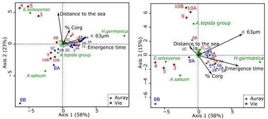 For the remaining samples, the axial plot of PCA1 and PCA2 shows an overlap between the two estuaries, with samples being organised mainly along PCA1, largely as a function of the percentage of H. germanica. For most sites where several stations were sampled at different altitudes, the higher samples (with longer emergence times) have higher values on PCA1.