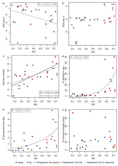 Relationship between MII and (a) PCA axis 1, (b) PCA axis 2, (c) number of species, (d) % Elphidium spp., (e) % Quinqueloculina spp. and (f) % Ammonia tepida group. Auray estuary: blue triangles; Vie estuary: red dots. All correlations were performed with Spearman tests, solid lines correspond to significant correlations. Regression lines are based on generalised linear model (a,c) and non-linear regression (d,e). The MII tends to be maximal at lower stations in the outer estuary and minimal at higher stations in the inner estuary.