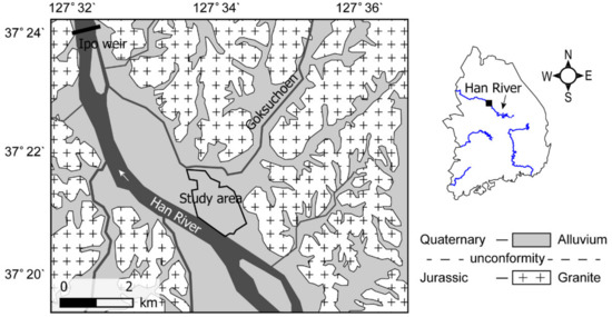 Location and geology of the study area in Han River Basin, South Korea (modified from [23]).