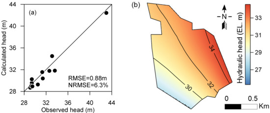 Calibration results: (a) comparisons between calculated and measured groundwater levels; (b) calculated groundwater level distributions.