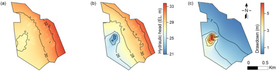 Our model results showed that water level fluctuations played an important role in stream–aquifer interactions, which is consistent with the previous research results [32,33]. Figure 5 and Figure 6 show the spatial variations in groundwater levels and drawdown resulting from opening the weir, which were presented by kriging with calculated values from calibrated model. During the non-seasonal pumping period (Figure 5), the groundwater level was higher than the river level, showing a gaining stream (Figure 5a), while once the river level decreased, the groundwater level fell near the river by approximately 2.7 m (Figure 5b). This groundwater drawdown decreased with distance from the river (Figure 5c).