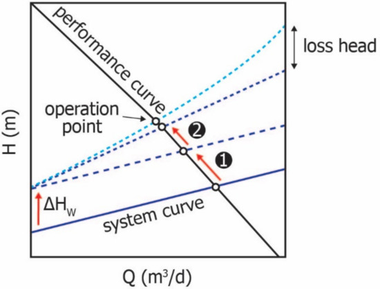 As groundwater drawdown is proportional to groundwater pumping rates, the system curve for the actual lift shows a linear change. However, groundwater pumping rates in actual wells increase nonlinearly with the head pressure due to frictional head losses. The inclination of the system curve, that is, the ratio of pumping rates and groundwater drawdown, decreases with aquifer productivity, that is, transmissivity. The intersection point between the pump performance curve and pump system curve is the operation point, which determines the pumping rate and groundwater level.