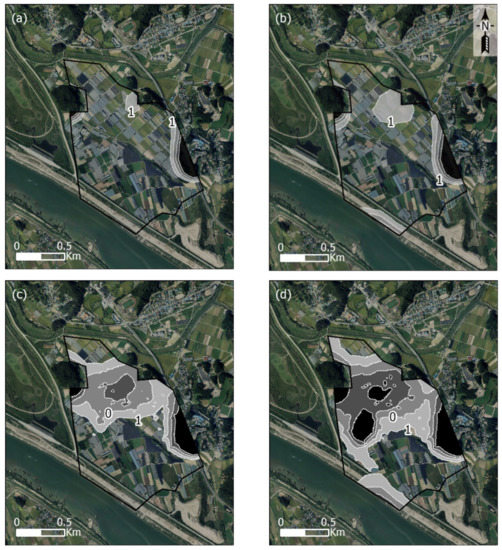 Areas where groundwater pumping by centrifugal pump was difficult, incorporating the spatial variation of PAT values less than 1 m (shaded area) with river levels during (a,b) non-seasonal pumping; (c,d) seasonal pumping, at (a,c) the Ipo Weir management level (28 m), and (b,d) at the minimum weir level (25.3 m).