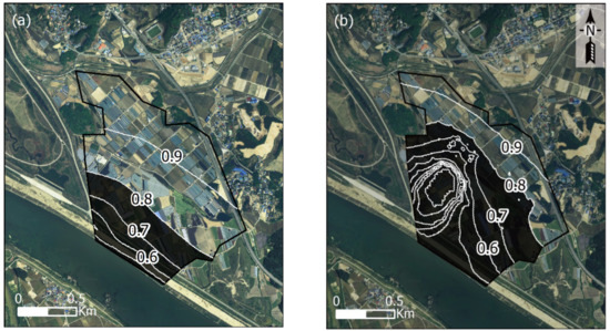 Areas in which aquifer productivity decreased due to opening of the weir, incorporating spatial variations of API values less than 0.8 (shaded area), during (a) non-seasonal and (b) seasonal pumping periods.