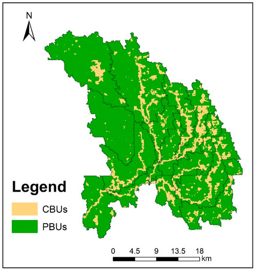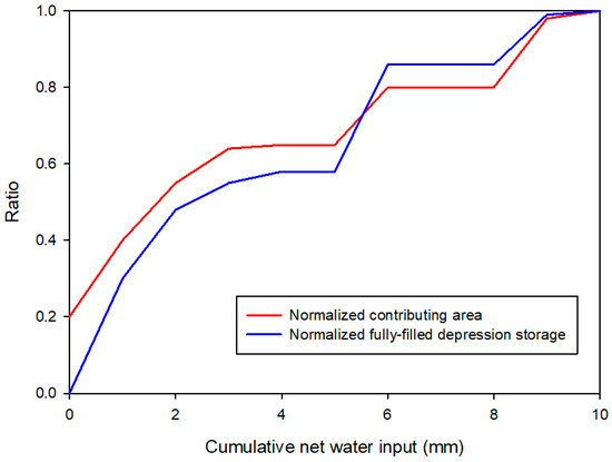 After the surface topography is characterized, the intrinsic influence of depressions on hydrologic connectivity is analyzed by using the method proposed by Zeng and Chu [19]. Specifically, a filling procedure is implemented to determine the relationship between water input and filling–spilling conditions of depressions. For a depression-dominated subbasin, a constant depth of net water input is uniformly applied to fill depressions, and the application of net water input continues until all depressions are fully filled. After each application of the net water input, the filling–spilling condition of each depression is analyzed, and the subbasin-contributing area, which consists of the areas of CBUs and PBUs with fully-filled depressions, is calculated. In addition, the cumulative depression storage of the fully-filled depressions is also computed after each application of net water input. When the fully-filled depression storage reaches the total depression storage of the subbasin (i.e., all depressions are fully filled), the intrinsic changing patterns of fully-filled depression storage and subbasin-contributing area (versus cumulative net water input) are obtained. Figure 1 shows an example of intrinsic changing patterns of the normalized contributing area and fully-filled depression storage. At the beginning of the application of net water input, the normalized contributing area is greater than zero, which represents the non-depressional area. As the application of net water input continues, the normalized contributing area and fully-filled depression storage increase, and the increase rates depend on the surface topographic characteristics (e.g., surface area and maximum depression storage of depressions). The stepwise patterns of both curves stem from the existence of depressions with larger maximum depression storage values that take a longer time to be fully filled. Such intrinsic changing patterns are further used to determine subbasin-contributing area, depression storage, and surface runoff under natural rainfall conditions; meanwhile, the cumulative net water input is also derived when the subbasin-contributing area or depression storage is known.