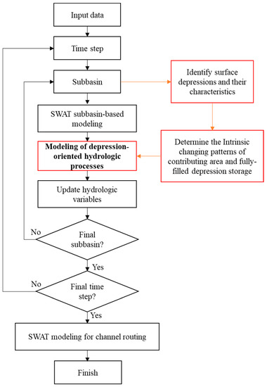 In SWAT, three functions (i.e., Pond, Wetland, Pothole), which utilize the lumped depression approach, are implemented to simulate the hydrologic impacts of depressions. To account for the filling–spilling of all depressions and the depression-oriented hydrologic processes, the SWAT-D is developed in the research reported in this paper. The overall modeling framework of SWAT-D and the modeling method of the threshold-controlled overland flow dynamics are detailed in the following subsections.