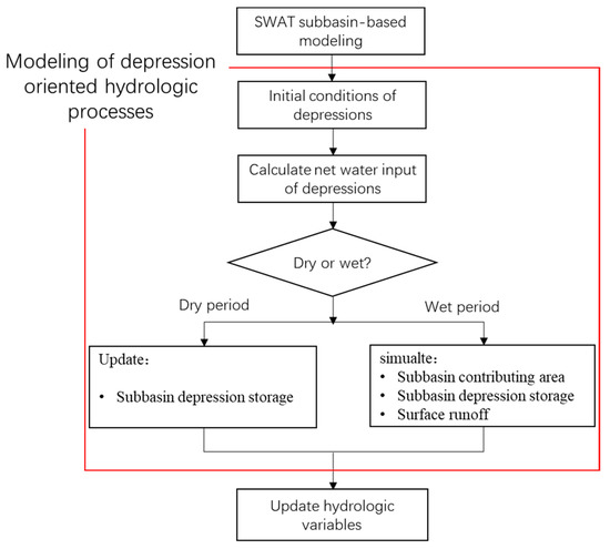 Following Zeng and Chu [19], the intrinsic changing patterns of depression storage and contributing area of a depression-dominated subbasin are determined, which can be further used to simulate the formation of subbasin-contributing area and generation of surface runoff during a rainfall/snowmelt event. Different from the event model proposed by Zeng and Chu [19], SWAT-D is a continuous model in which more impact factors, such as water losses from depressions, are simulated. Therefore, SWAT-D tracks not only the filling–spilling overland flow dynamics during wet time periods but also water depletion in depressions during dry time periods. Figure 3 shows the modeling framework of the SWAT-D in simulating the depression-oriented hydrologic processes.